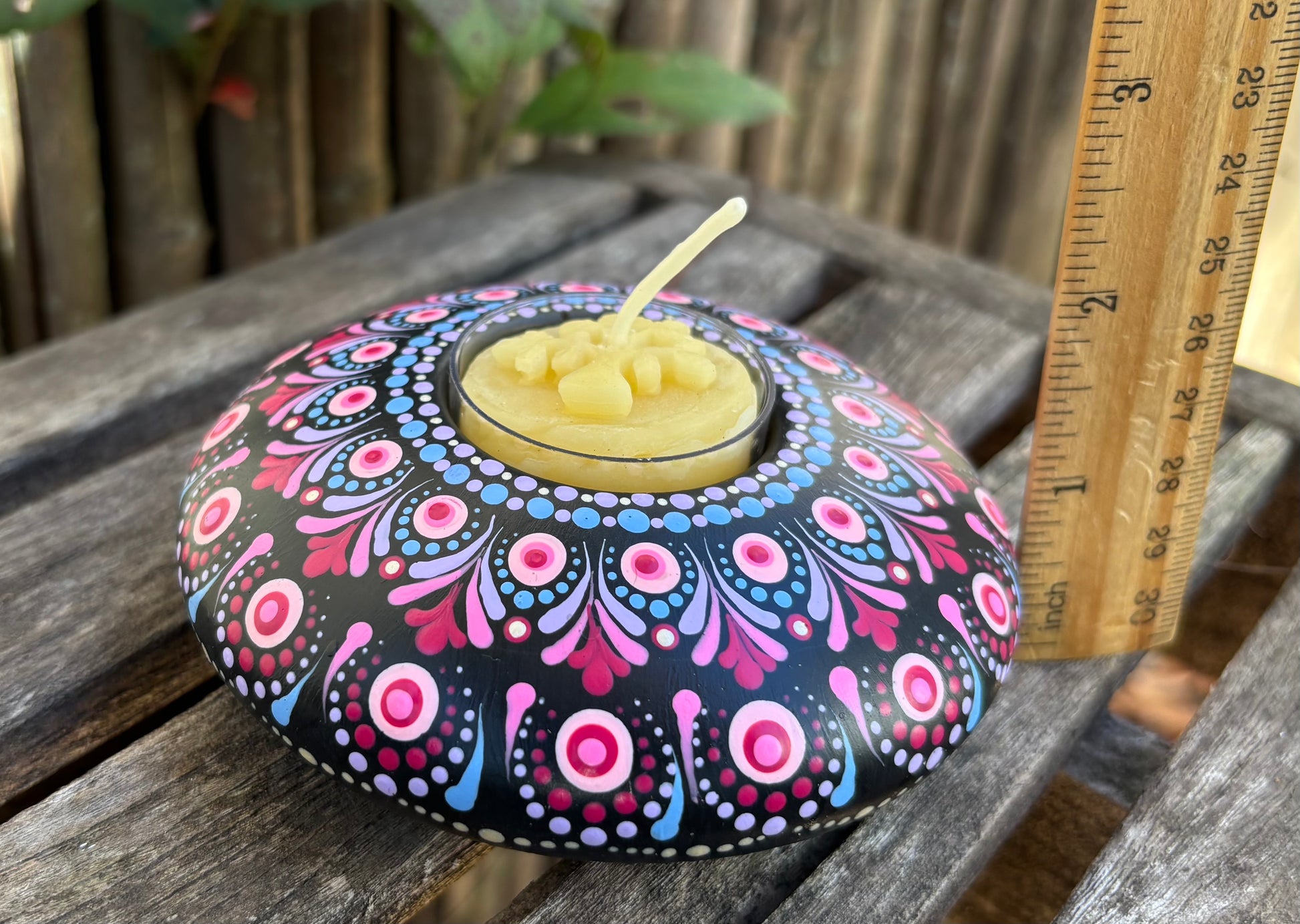 Gorgeous hand-painted mandala tea light candle holder. Poured concrete and sealed with marine varnish. This is a beautiful, unique piece.