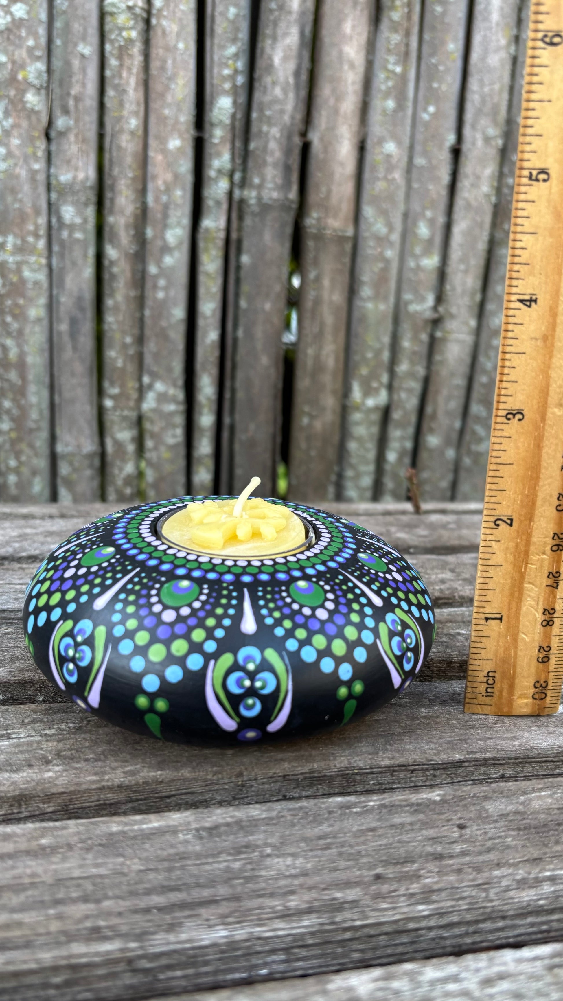 Gorgeous hand-painted mandala tea light candle holder. Poured concrete and sealed with marine varnish. This is a beautiful, unique piece.