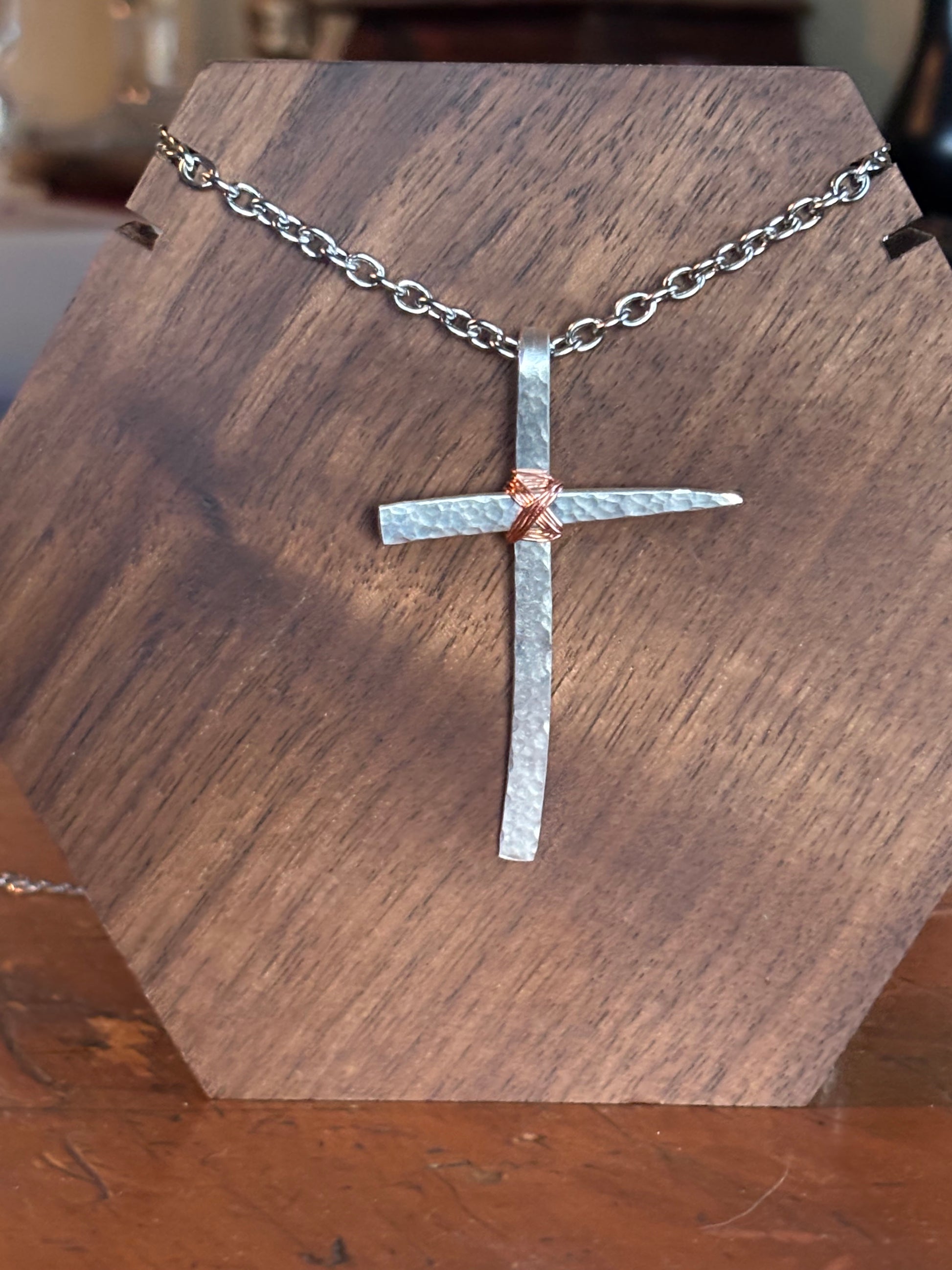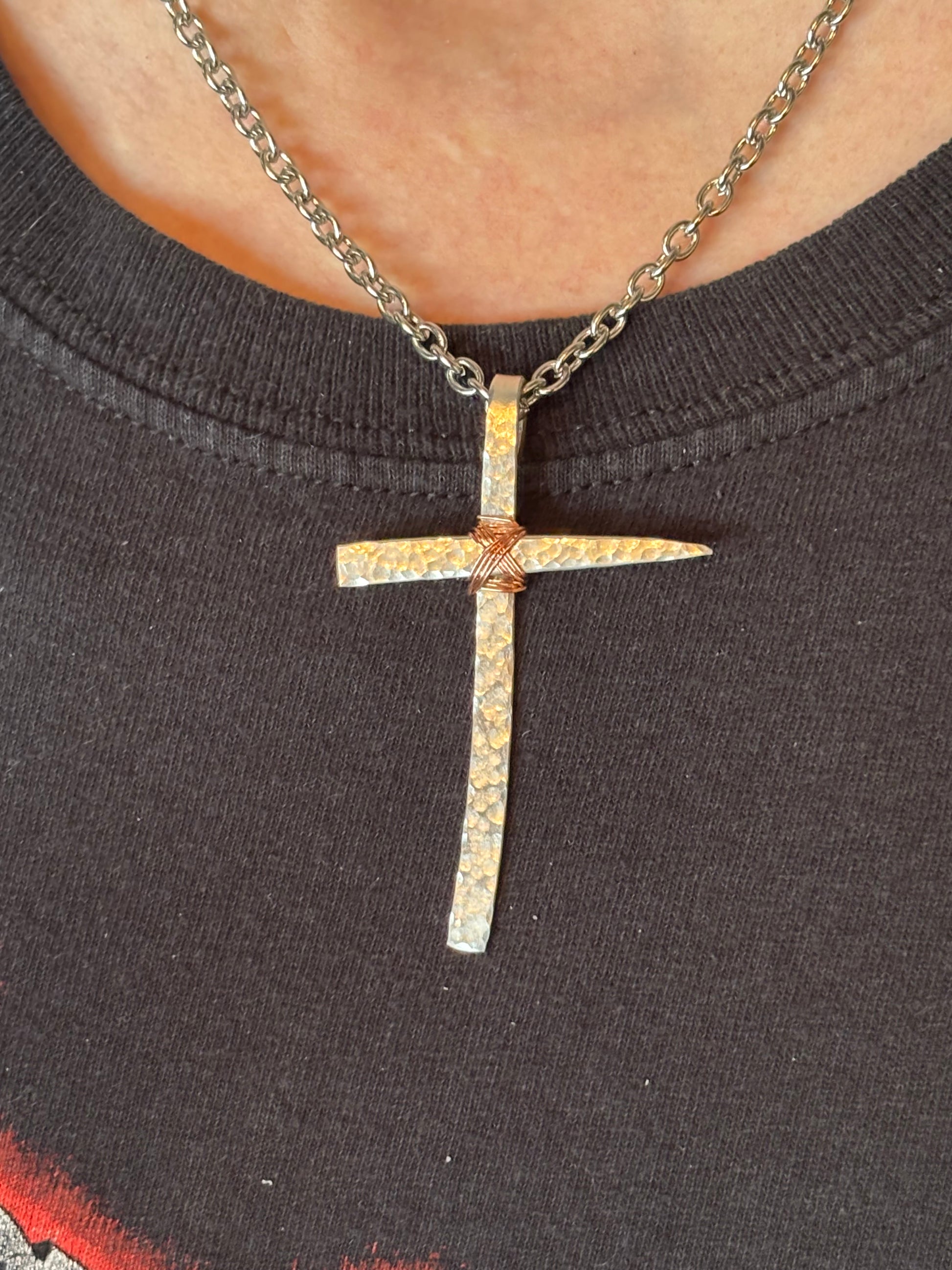This unique cross pendant was created from the tines of a vintage silver-plated fork. Hand hammered and wrapped with pure copper wire