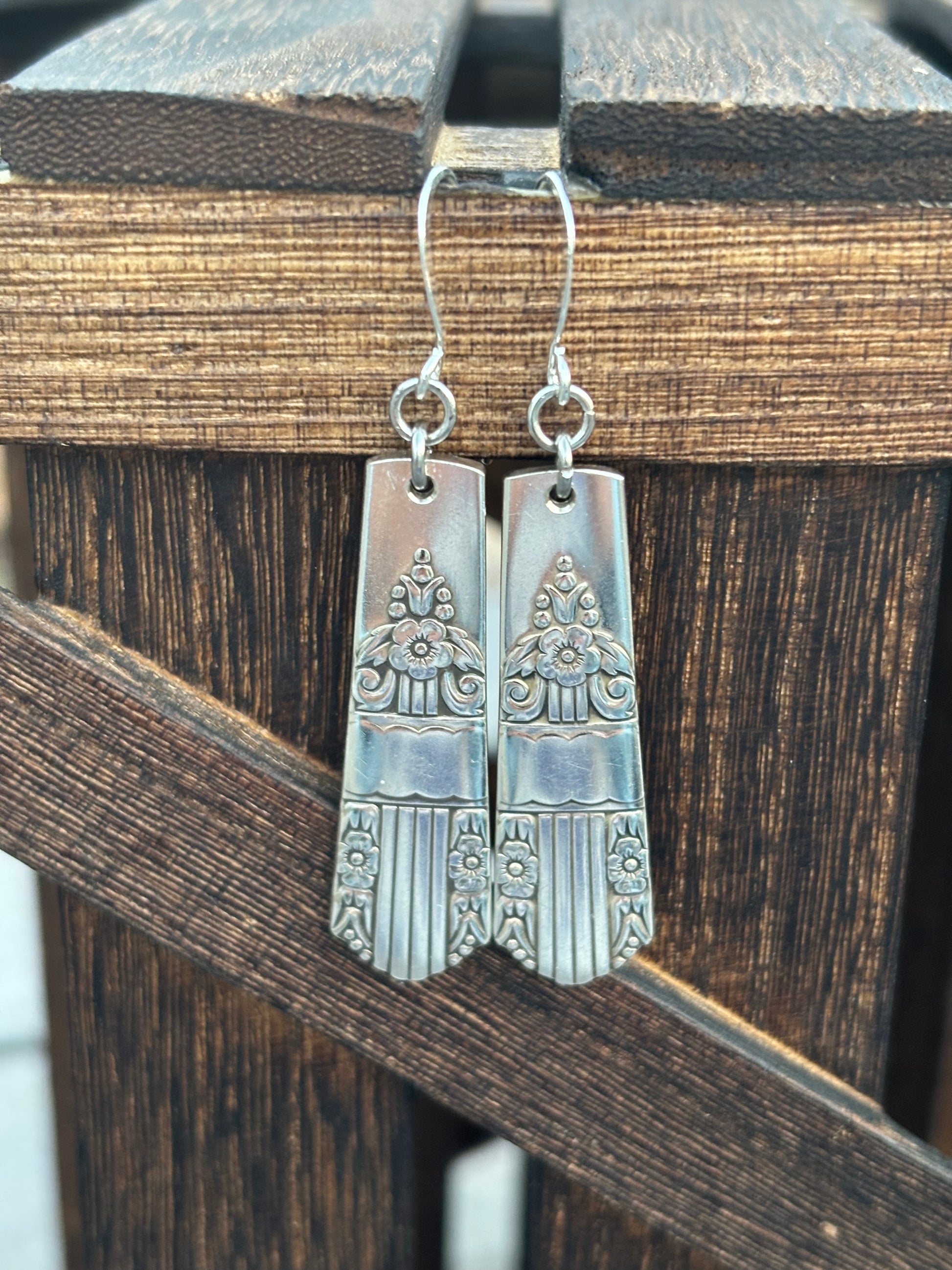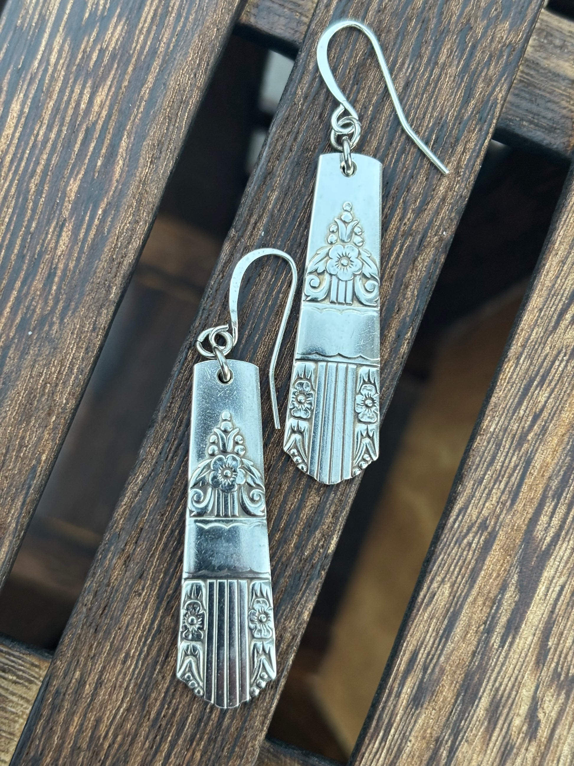 This unique pair of vintage silver plated earrings were created using the handles from forks/spoons