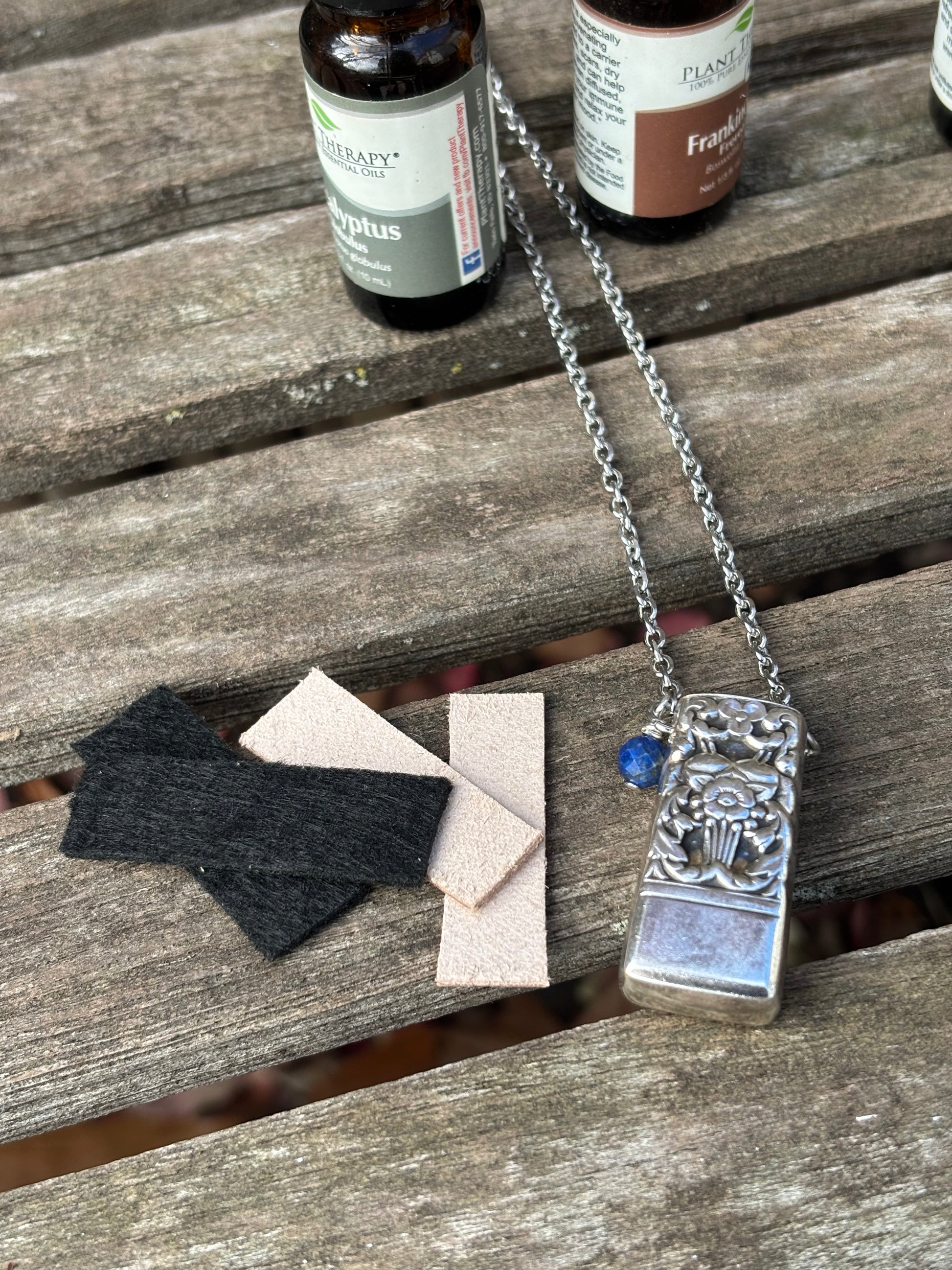 Included are leather and felt pieces. Just add a few drops to one and slip inside your diffuser.